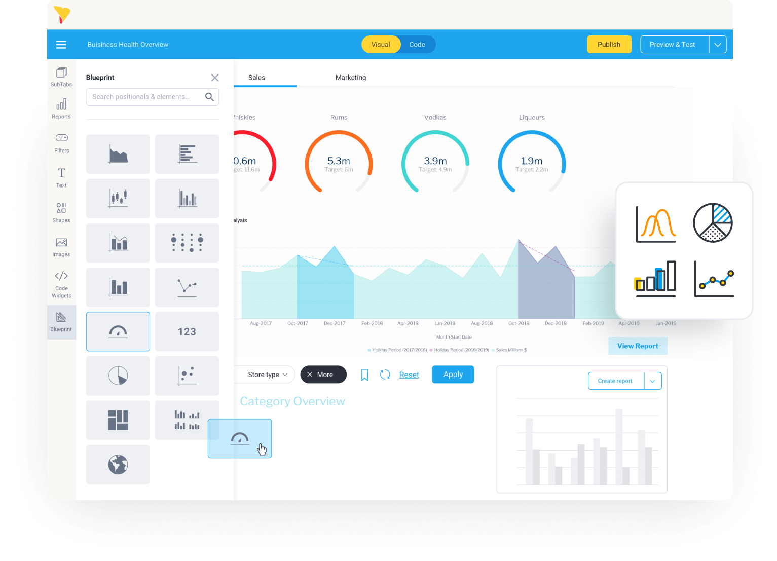 Los Cuadros de Mando Yellowfin tienen un aspecto estupendo nada más sacarlos de la caja, y con nuestro diseño fácil de usar y nuestras flexibles herramientas para desarrolladores, puedes incrustarlos o ampliarlos fácilmente y crear experiencias analíticas altamente personalizadas que se adapten a tus necesidades específicas. Los widgets avanzados, los botones de acción y la funcionalidad sin código/con poco código, junto con nuestra API JavaScript, te dan la libertad de hacer cosas en tus cuadros de mando que ni siquiera se nos han ocurrido.