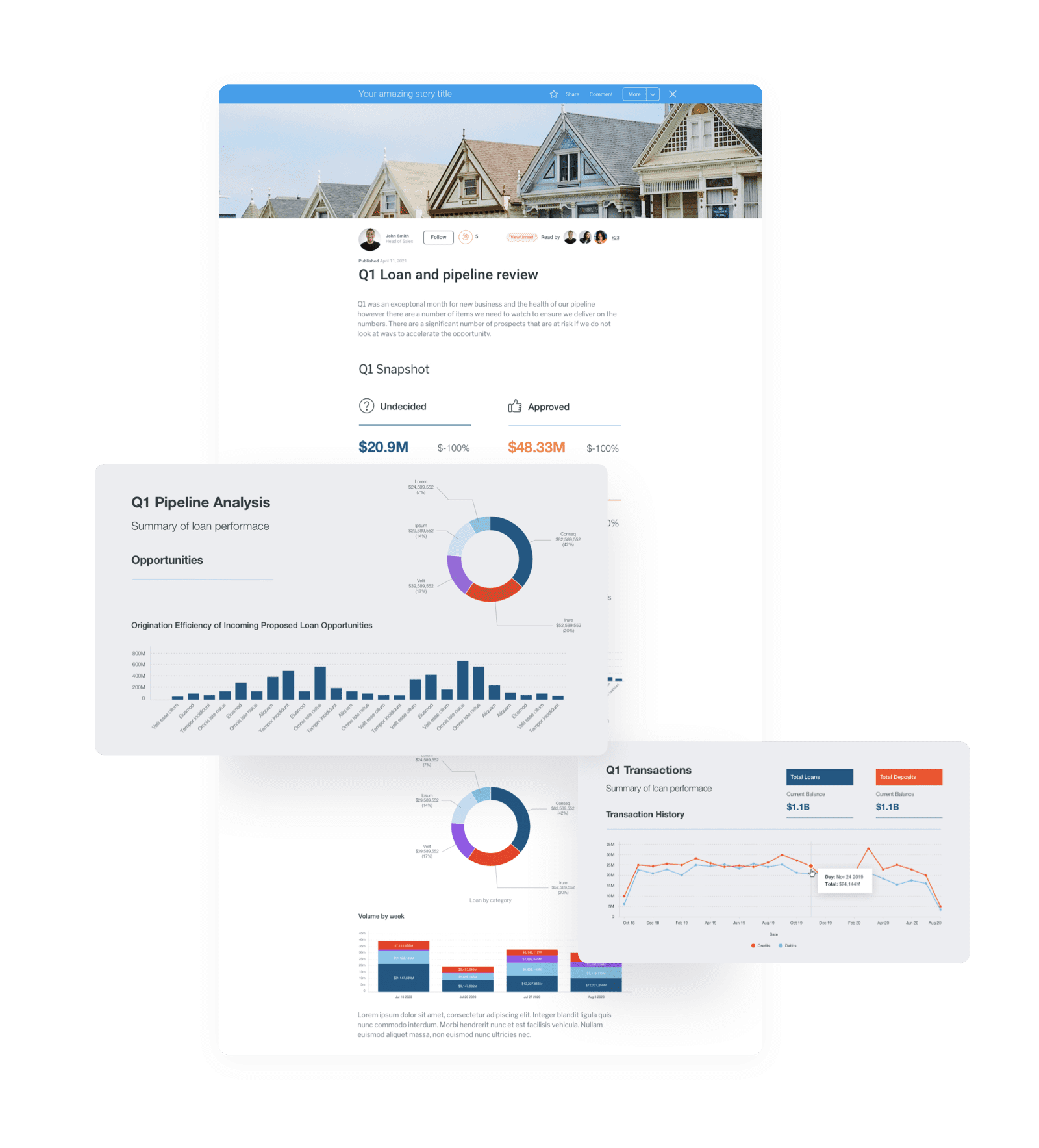 Amplifiez vos mises à jour commerciales avec des vidéos, des images et d'autres médias interactifs entièrement intégrés. Intégrez des rapports de BI directement dans vos mises à jour, ou même des widgets provenant d'applications SaaS tierces. Que vous utilisiez le format de blog long format des Stories ou les présentations transparentes de Present, vous fournissez un contexte précieux à vos données quotidiennes, plus précieux que les données elles-mêmes.