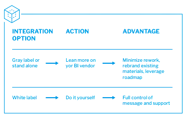 Each of these choices has their pros and cons. If you are looking to deliver best in class, then a white or gray label option is most likely your preferred route, as you want to make it clear that this is your product and create a competitive gap. If you choose to maintain the branding of the third party tool, then you may lose customer “stickiness” or attachment to your product, and customers may wonder, “why can’t we use any analytical tool for access to data?”